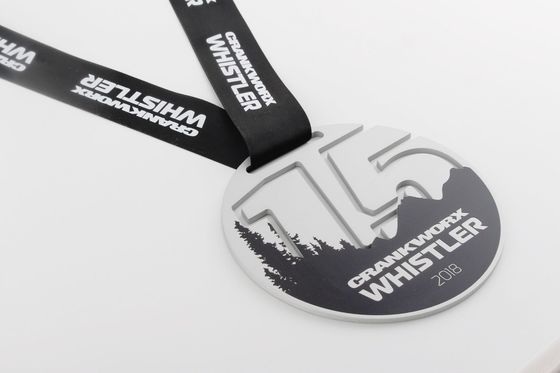 The medals made by zinc alloy material and die casting processing, 2D level model with soft enamel colors, the design is from our customer and custom size of 80mm and thickness 4MM. 850*25mm one color printing ribbon